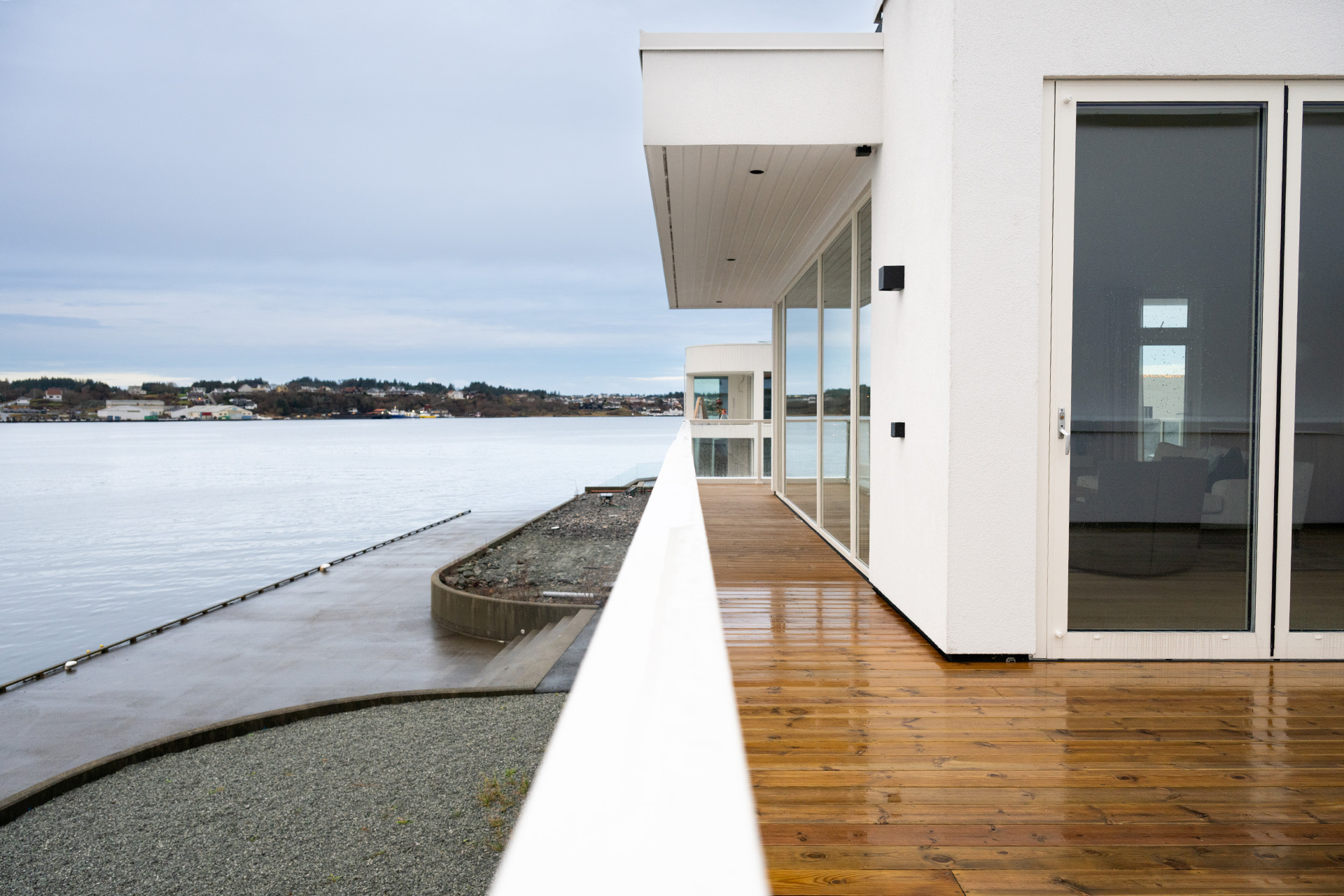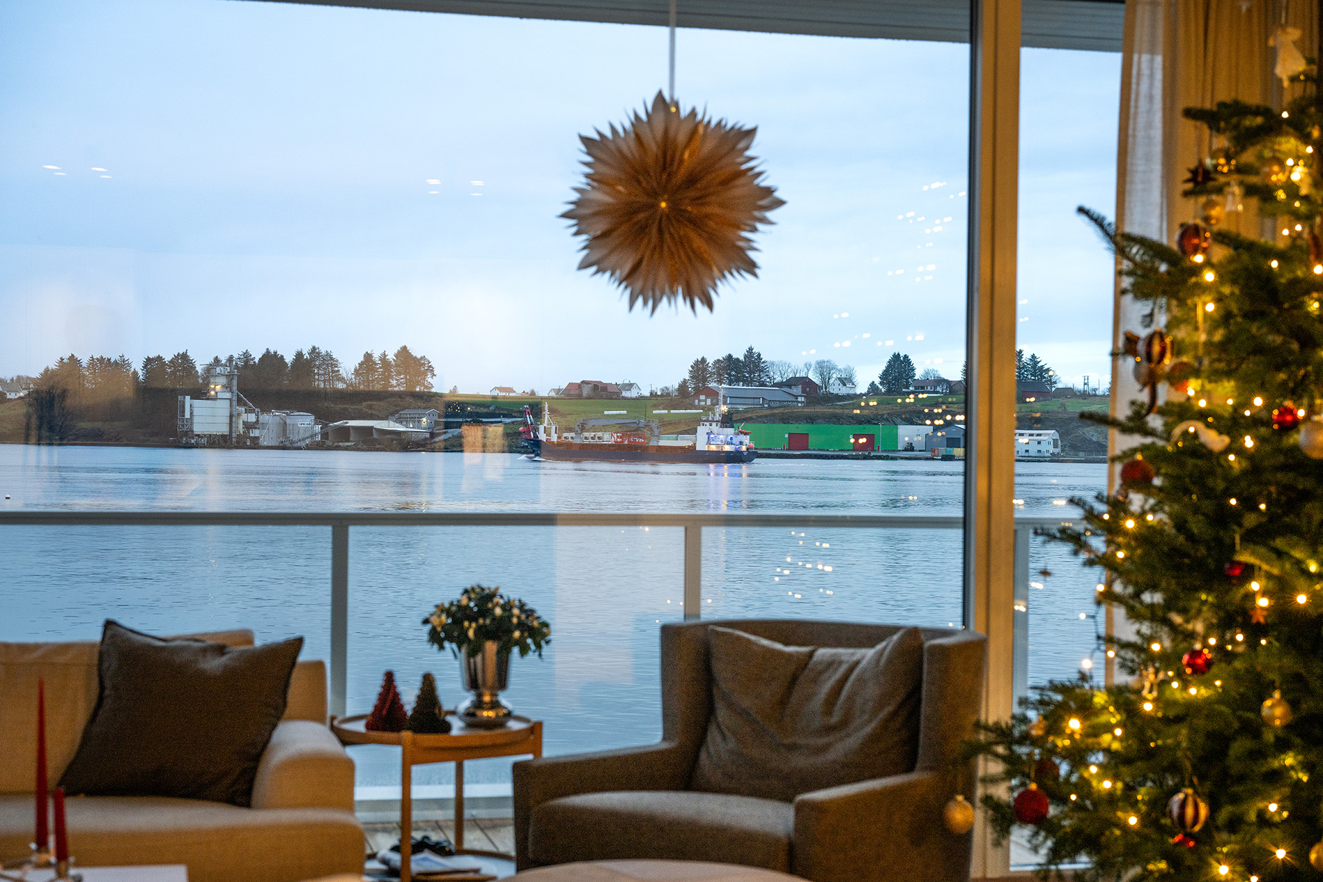 Fra både første og andre etasje har de panoramautsikt mot Karmsundbrua, og full oversikt over små og store fartøy som glir gjennom Smedasundet. Å få maksimal utnyttelse av utsikten har vært viktig når huset skulle utformes og bygges. Det har resultert i en åpen kjøkken- og stueløsning, og dette fellesrommet har nå blitt favoritten i huset.